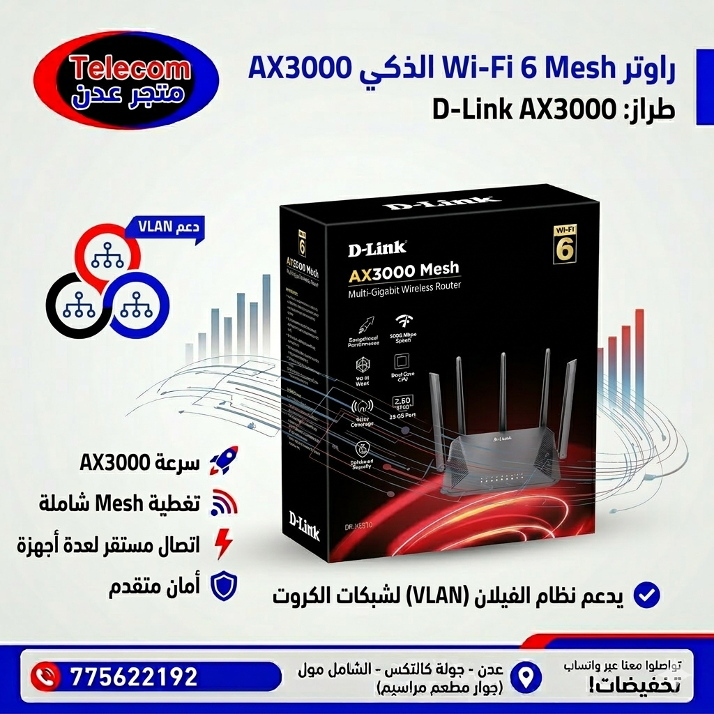 يعتبر راوتر D-Link AX3000 موديل (DIR-X3010) الخيار الأول والذكي لأصحاب شبكات الويفي والمنازل الذكية في عدن. بناءً على ذلك، إذا كنت تبحث عن أداء مستقر، فإن هذا الجهاز يمنحك القدرة الكاملة على توزيع إنترنت ستارلينك عدن بسرعته الحقيقية. علاوة على ذلك، وبفضل تقنيات Wi-Fi 6 المتطورة، فإنه يمنع أي اختناق في البيانات، مما يجعله أفضل مودم شبكة في السوق حالياً.